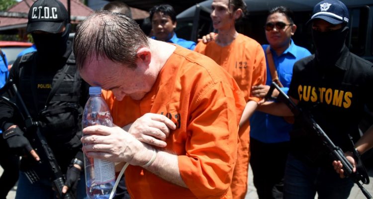Accused drug smugglers from Chile (L) and Switzerland (R) attend a press conference at the customs office near Ngurah Rai Airport in Denpasar on Indonesia’s resort island of Bali on December 18, 2019. – Five accused drug smugglers from Hong Kong, Chile, Switzerland and Thailand who were caught in Bali could face the firing squad if convicted, police on the Indonesian holiday island said on December 18. (Photo by SONNY TUMBELAKA / AFP)